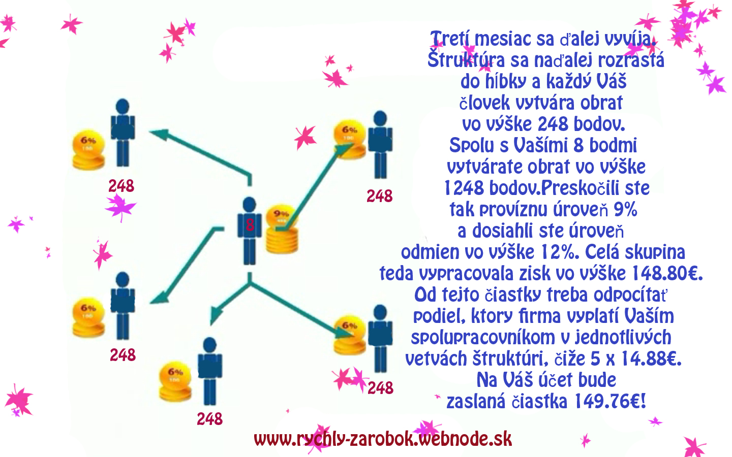 Uvedieme si situáciu, kedy vytvoríte skupinu s piatimi ľuďmi, ktorí pôjdu vo Vašich šlapajach a taktiež budú vytvárať skupiny s piatimi ľuďmi, kde každý člen vrátane Vás bude plniť kvalifikačný mesačný nákup, zakúpením dámskeho parfumu alebo dvoch iných produktov z našej ponuky.